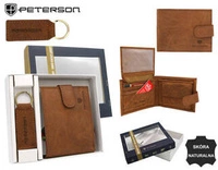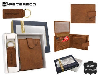 Trzyczęściowy zestaw prezentowy: portfel męski, etui na karty płatnicze i brelok ze skóry naturalnej Peterson PTN SET3-N79L-VT Brown