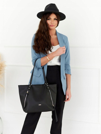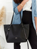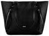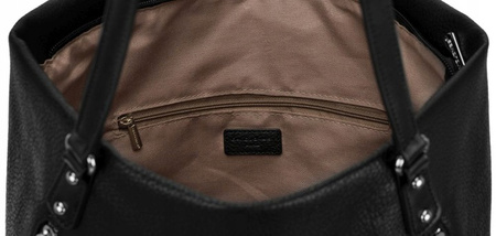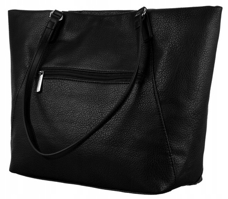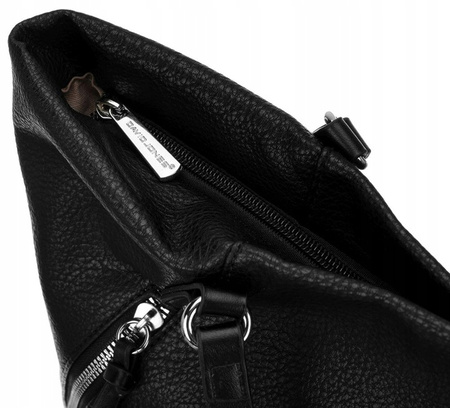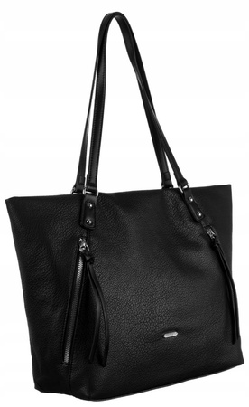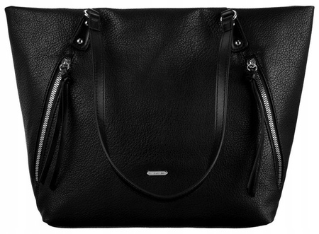 - Duża, mieszcząca format A4 torebka w kształcie trapezu. Wykonana z wysokojakościowej skóry ekologicznej. Na froncie logo marki David Jones i ukośne kieszenie na suwaki. Model jednokomorowy, na podszewce. Wewnątrz niezbędne przegródki.