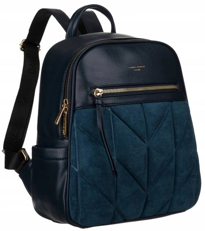 - Odszyty z ekologicznej skóry z frontowym panelem obszytym pikowanym eko zamszem. Ma jedną komorę zamykaną suwakiem. W wyposażeniu uchwyt na dłoń i długie szelki.