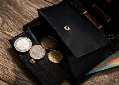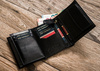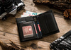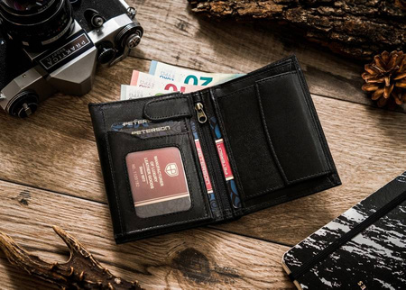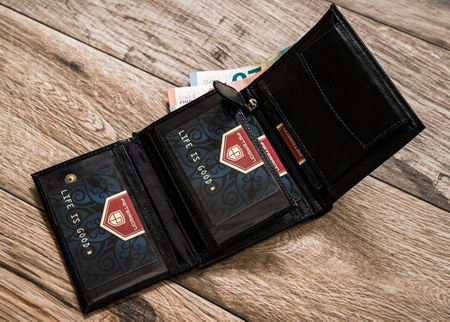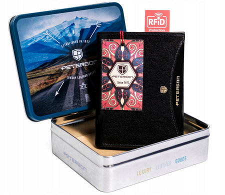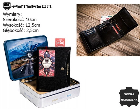 - Large natural leather wallet with no external clasp. Secured with an anti-theft RFID Stop membrane. Inside tabs for cards and a pocket for a registration card. In addition, traditional sections for cash. Wallet in a metal case.