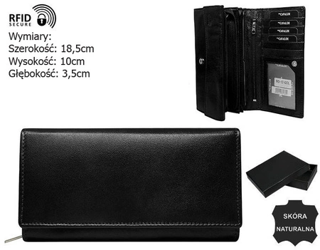 - Leather ladies wallet closed with a flap. Secured with an RFID Stop membrane. Product without a logo- a possibility of stamping your own company logo.