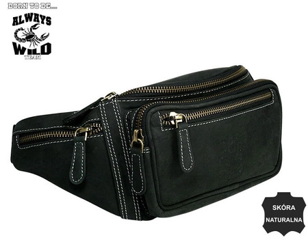 - Classic men's kidney with adjustable beltsem. Made of good quality natural leather. On the front the brand logo Always Wild. Accessory with one zippered compartment and external zippered pockets.