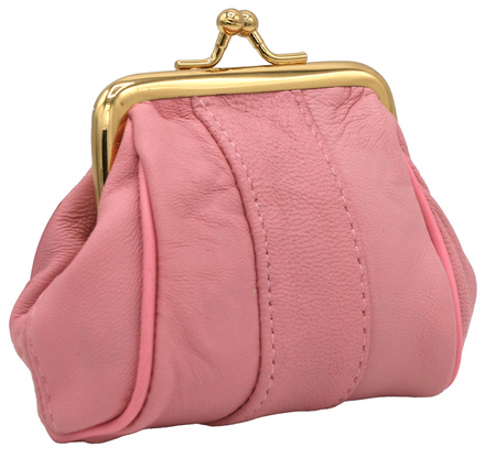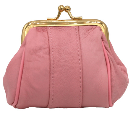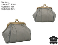 - Compact coin purse made of genuine leather. It features a structure with subtle pleats. Closes with a gold kiss lock. Inside, it has a single compartment without additional dividers. No Logo product.