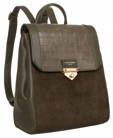 - It is sewn from ecological leather. The flap is decorated with an embossed pattern imitating crocodile skin. The backpack has a double compartment closed with a flap. It comes with a hand grip and adjustable suspenders.