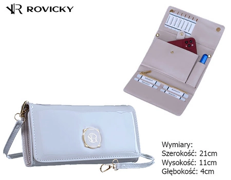 - Torebka wizytowa portfel 2w1 odszyta ze skóry ekologicznej lakierowanej. Wyposażona w przegródki na karty, dokumenty, gotówkę, kieszeń na telefon. Torebka wykończona złotymi okuciami. W komplecie dopinany długi pasek na ramię.