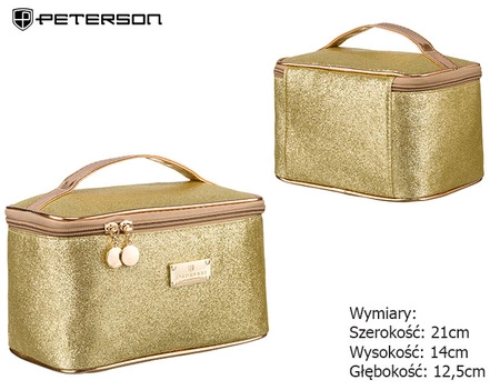 - A large glitter cosmetic bag with a gold handle for easy carrying. The front is adorned with an exclusive plaque featuring the Peterson brand logo. The zippers are decorated with round, ornamental pullers. Hardware and finishes are in a gold color.