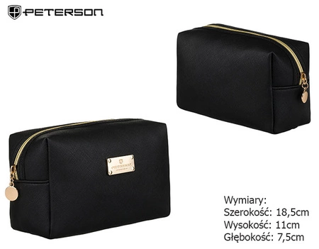 - A single-compartment, classic travel cosmetic bag. Crafted from premium synthetic material with a distinctive saffiano texture. The front features a large gold plaque with the Peterson® logo. The zipper is adorned with a jewelry-inspired gold charm.