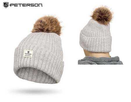 The crown of the hat is adorned with a fluffy, detachable faux fur pom-pom in natural shades of brown. Its softness and lightness lend subtle elegance and grace to your winter look. The front showcases the elegant Peterson logo, a mark of attention to detail and a symbol of high-quality craftsmanship.