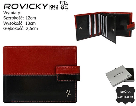 Skórzany portfel męski marki Rovicky to połączenie elegancji i funkcjonalności. Wykonany z wysokiej jakości skóry w kolorach czarnym i czerwonym, posiada kieszonkę na monety zapinaną na zatrzask, kieszonkę na suwak oraz przegródki na karty. Z metalowym logo marki, zapakowany w eleganckie pudełko, idealny na prezent. Wysoka jakość i styl w jednym.