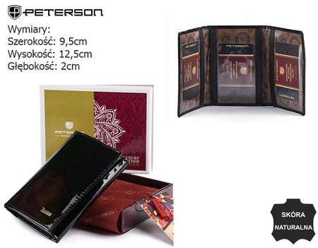 - Skórzane etui na dokumenty Peterson to połączenie elegancji i funkcjonalności. Wykonane z lakierowanej skóry, z metalowym logo, zapewnia stylową ochronę dla dokumentów. Zapakowane w pudełko, doskonałe na prezent. Wysoka jakość i klasyczny design w jednym.