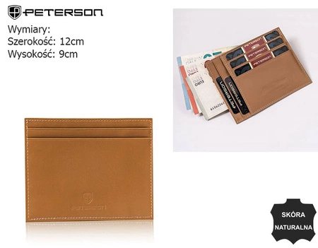 - Skórzane etui na karty marki Peterson to elegancki i praktyczny dodatek. Wykonane z wysokiej jakości skóry, wyróżnia się prostym designem i subtelnym tłoczonym logo. Kompaktowe i trwałe, idealne do codziennego użytku.
