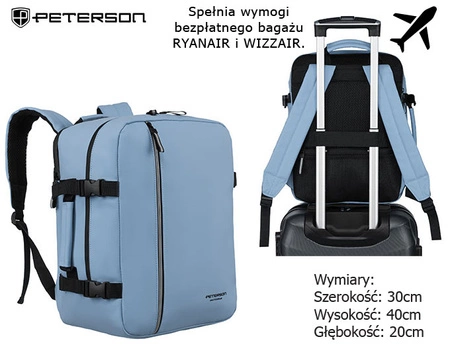 - Plecak Peterson z wodoodpornej tkaniny to doskonały wybór na podróż. Zgodny z wymiarami bagażu podręcznego WizzAir, lekki i pojemny. Funkcjonalne kieszenie ułatwiają organizację, a wygodne szelki zapewniają komfort noszenia. Idealny na każdą okazję!