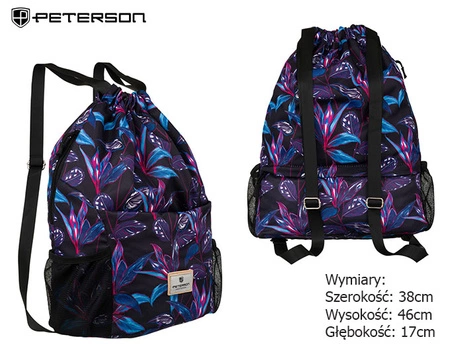 - Lekki i funkcjonalny plecak Peterson, wykonany z trwałej tkaniny poliestrowej, odporny na uszkodzenia. Minimalistyczny design z logo na naszywce sprawia, że świetnie sprawdzi się na co dzień – na trening, zakupy czy krótkie wyjazdy.