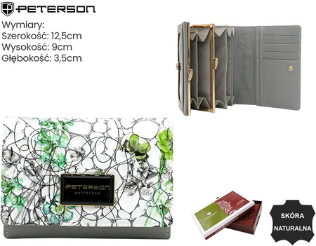 - Portfel damski skórzany Peterson z dużym czarno-złotym logo i oryginalnym wzorzystym frontem to elegancka propozycja na co dzień. Wykonany z wysokiej jakości skóry, łączy funkcjonalność z modnym designem. Pakowany w pudełko, doskonały na prezent.