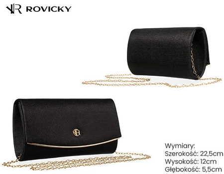 Elegancka kopertówka Rovicky z połyskującego materiału, ozdobiona metalowym logo. Posiada odpinany łańcuszek, umożliwiający noszenie na ramieniu lub w ręku. Idealna na wieczorne wyjścia i specjalne okazje.