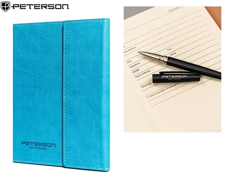 Elegancki zestaw marki Peterson: notes A5 i długopis, całość zapakowana w stylowe pudełko. Idealny do biura, na spotkania i jako prezent. Wysoka jakość wykonania i praktyczny format to połączenie stylu i funkcjonalności.