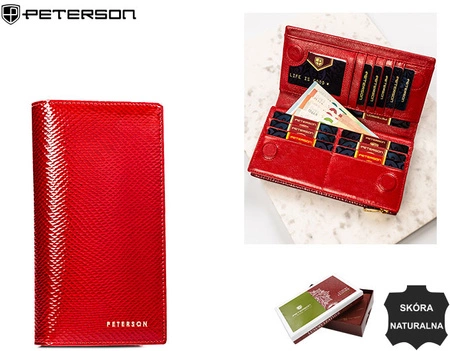 - Elegancki portfel damski marki Peterson, wykonany z wysokiej jakości skóry naturalnej. Zamykany na magnes, posiada liczne przegródki na karty i gotówkę. Całość zapakowana w stylowe pudełko – idealny na prezent.