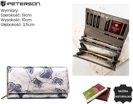 - Elegancki portfel damski marki Peterson, wykonany z wysokiej jakości skóry naturalnej. Posiada liczne przegródki na karty, gotówkę i dokumenty. Zapakowany w stylowe pudełko – idealny jako elegancki prezent.
