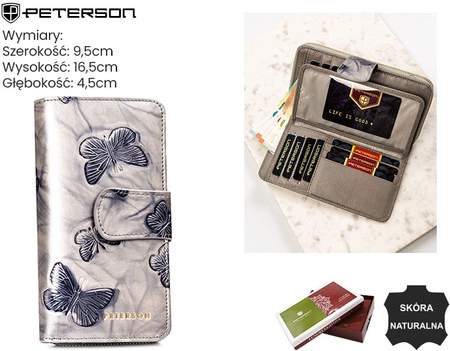 - Damski portfel skórzany marki Peterson w pionowym układzie to stylowy i funkcjonalny dodatek. Wykonany z wysokiej jakości skóry, oferuje wygodną organizację. Zapakowany w eleganckie pudełko, idealny jako prezent na każdą okazję.