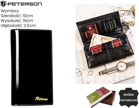 - Damski portfel skórzany marki Peterson w pionowym układzie to elegancki i funkcjonalny dodatek. Posiada wygodne zapięcie na magnes, zapewniając bezpieczeństwo. Zapakowany w eleganckie pudełko, idealny jako prezent na każdą okazję.