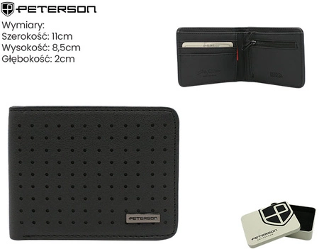 - Portfel męski Peterson z wysokiej jakości skóry ekologicznej. Elegancki, nowoczesny design, zabezpieczenie RFID. Idealny na prezent – zapakowany w stylową puszkę. Funkcjonalny portfel męski z ochroną danych.