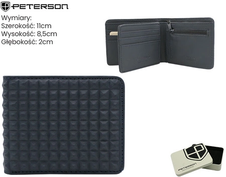 - Portfel męski Peterson z wysokiej jakości skóry ekologicznej. Elegancki, nowoczesny design, zabezpieczenie RFID. Idealny na prezent – zapakowany w stylową puszkę. Funkcjonalny portfel męski z ochroną danych.