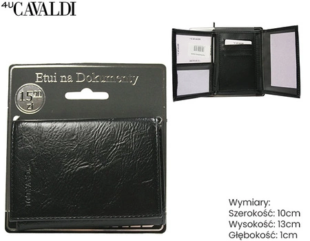 - Etui na dokumenty Cavaldi wykonane ze skóry ekologicznej, z tłoczonym logo. Prosty i praktyczny model do codziennego użytku. Pakowane na blister – odpowiednie do ekspozycji i sprzedaży.