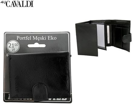 - Portfel męski Cavaldi wykonany ze skóry ekologicznej. Klasyczny model do codziennego użytku, z miejscem na karty i gotówkę. Pakowany na blister – gotowy do sprzedaży.