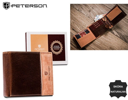 - Sewn from natural leather. Two-color wallet in horizontal orientation without clasp. Extended interior has many practical compartments. Equipped with RFID BLOCKING SYSTEM technology.
