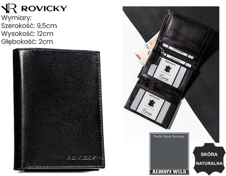 Portfel męski Rovicky wykonany z naturalnej skóry. Klasyczny design, praktyczny układ – miejsce na karty, dokumenty, monety i banknoty.