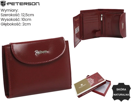 Poziomy portfel damski z zapięciem na zatrzask. Wykonany z jednolitej skóry naturalnej. Wewnątrz zakładki na karty i dokumenty. Sekcje na gotówkę standardowe z przegródką na monety zamykaną zatrzaskiem.