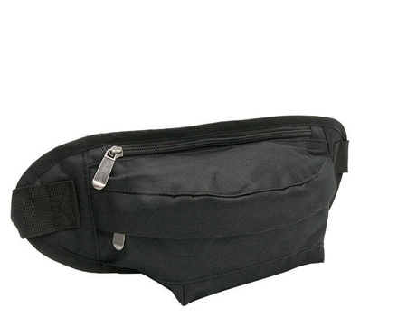 - Made of polyester. The pouch can be worn on the hip, belt or over the shoulder. The pouch is single-compartment, fastened with a solid zipper. One zippered pocket each is embroidered on its front and reverse.