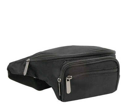 - Polyester kidney case. Worn on the hip, belt or over the shoulder. Single-compartment pouch, fastened with solid zippers. Two zippered pockets on the front, with an additional pocket embroidered on the back.