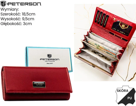 - Pojemny portfel damski Peterson w orientacji poziomej, wykonany z połączenia skóry naturalnej i PU. Wyposażony w kieszonkę na bilon zamykaną na bigiel. Elegancko zapakowany w pudełko.