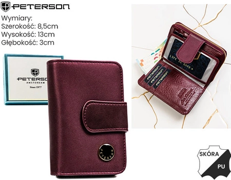 - Pionowy portfel damski Peterson z połączenia skóry naturalnej i PU, zapinany na elegancką zapinkę. Stylowy, praktyczny i zapakowany w pudełko – idealny do sklepu internetowego.