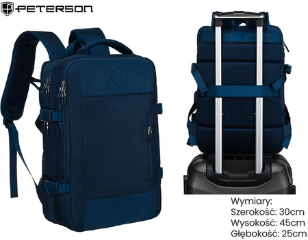 - Plecak podróżny Peterson z wytrzymałej tkaniny poliestrowej. Miękkie, wygodne ramiączka, przemyślany układ kieszonek i praktyczny uchwyt do mocowania na walizce. Lekki, funkcjonalny i idealny w podróży.