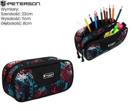 - Piórnik Peterson z trwałej tkaniny to praktyczny model z dwiema komorami, które ułatwiają organizację. Wygodny i uniwersalny, sprawdzi się w szkole, na studiach i w pracy, łącząc funkcjonalność z prostym designem.