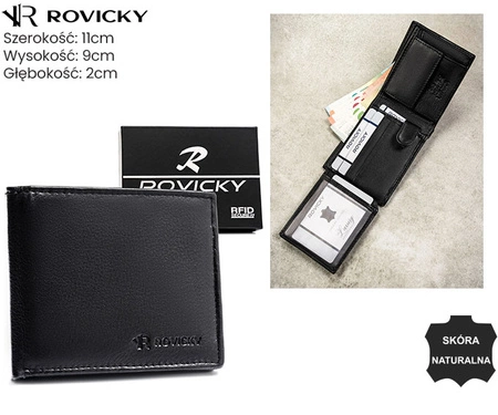 - Męski portfel skórzany marki Rovicky z przemyślanym układem przegródek i zabezpieczeniem RFID chroniącym karty. W zestawie pudełko – praktyczny wybór do sprzedaży hurtowej i na prezent.