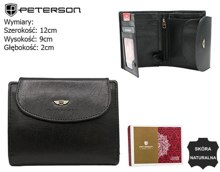 - Sewn from natural leather. Horizontally oriented model, fastened with a snap flap, the front of the wallet is decorated with the brand's gold lettering. Equipped with RFID system.