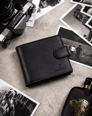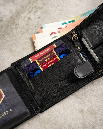 The wallet, the centerpiece of the set, impresses with its classic yet masculine design. Made from premium-quality genuine leather in a deep black hue, it features subtle embossed branding of the Peterson logo, which discreetly emphasizes the product’s prestige. The smooth leather texture provides an exclusive finish, while solid stitching highlights the meticulous attention to detail.