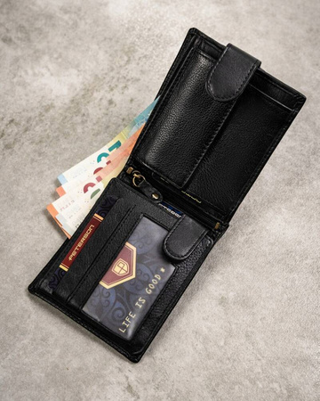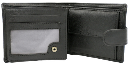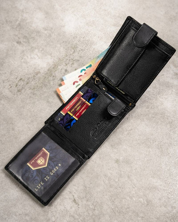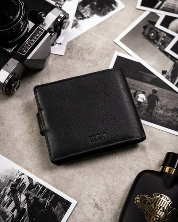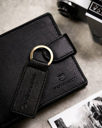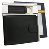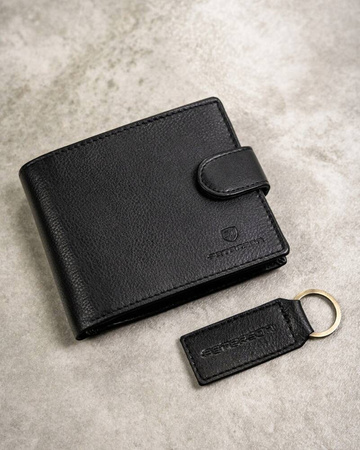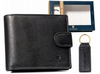 - A two-piece men's gift set consisting of a wallet and a keychain made of genuine leather, packaged in a branded box. The wallet is equipped with an RFID STOP anti-theft system and comfortably fits a vehicle registration document.
