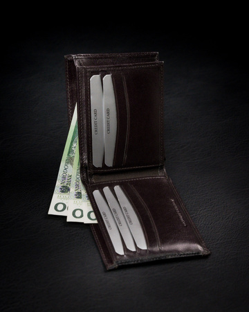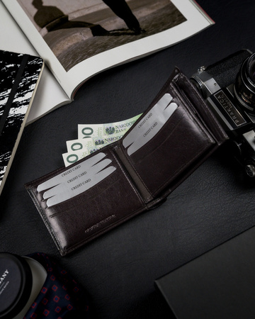 - Elegancki, brązowy, skórzany portfel męski w orientacji poziomej. Portfel wyposażony w rozbudowaną sekcję na karty, w tym wyjmowane etui, schowek na większe dokumenty np. dowód rejestracyjny i klasyczne wnętrze na gotówkę. Pudełko producenta. Ochrona RFID