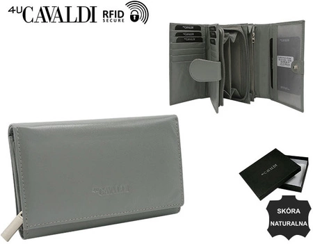 - Szary, skórzany portfel damski o średniej wielkości i rozbudowanym wnętrzu zarówno na karty, dokumenty jak i gotówkę. Mieści dowód rejestracyjny. Membrana RFID STOP. Portfel zapakowany w pudełko producenta.
