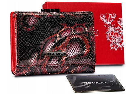 - Małą, elegancka portmonetka damska na zatrzask i bigiel odszyta ze skóry naturalnej zdobionej tłoczeniami imitującymi skórę węża. Model z rozbudowaną sekcją na karty i dokumenty. Mieści dowód rejestracyjny. Ochrona RFID STOP. Pudełko producenta.