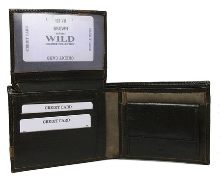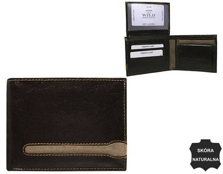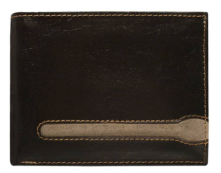 - Poziomy portfel bez zewnętrznego zapięcia. Wykonany z gładkiej skóry naturalnej dobrej jakości. Na froncie ozdobna, kontrastowa wstawka. Akcesorium wyposażone w wygodną sekcją na karty i dokumenty — zmieści dowód rejestracyjny.