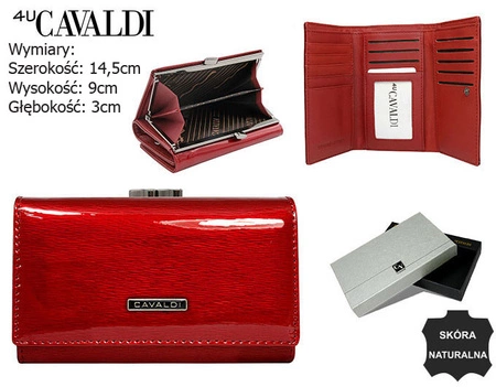 - Średniej wielkości czerwona portmonetka damska na zatrzask i bigiel wykonana z lakierowanej skóry naturalnej. Model wyposażony w rozbudowaną sekcję na karty i dokumenty 17 przegródek i klasyczną sekcję na gotówkę. Mieści dowód rejestracyjny.