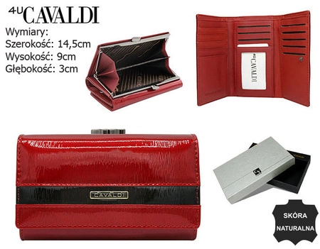 - Czerwona portmonetka damska na zatrzask i bigiel wykonana z lakierowanej skóry naturalnej. Model z rozbudowanym wnętrzem na karty i dokumenty - 17 przegródek i klasyczną sekcją na gotówkę. Portfel mieści dowód rejestracyjny. Pudełko prezentowe.