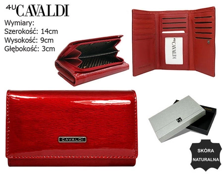 - Czerwony średniej wielkości portfel damski odszyty z lakierowanej skóry naturalnej. Model z rozbudowanym wnętrzem na karty i dokumenty - 17 przegródek i klasyczną sekcją na gotówkę, w tym zewnętrzną zamykaną na suwak kieszenią na bilon. Pudełko producenta