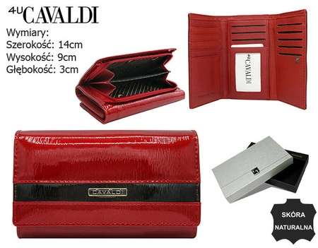 - Skórzany czerwony portfel damski na zatrzask i suwak. Model lakierowany zdobiony czarną wstawką. Portfel wyposażony w rozbudowaną sekcję na karty i dokumenty - 17 przegródek i klasyczne wnętrze na gotówkę. Mieści dowód rejestracyjny. Pudełko prezentowe.