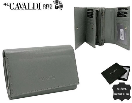 - Szary portfel damski z bydlęcej skóry naturalnej. Chroniony klapą z wytłoczonym logo marki Cavaldi. Portfel z klasycznymi sekcjami na gotówkę. Zabezpieczony antyskimmingową membraną RFID Stop. Zapakowany w pudełko.